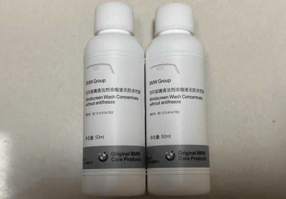 我立马在My BMW App里面的商城下单了两瓶宝马原厂玻璃浓缩液。小小一瓶50ml装,按照使用说明以1:100的兑水比例,至多可以兑到5L左右的玻璃水。虽然需要自己兑水,但是好处也是可以用多少就兑多少,我觉得比囤大瓶装在家更方便,且不占空间,因为有时候大瓶装不一定能一次使用完。另外,算下来成本也是比大瓶的性价比更高。唯一需要大家注意的是,尽量用纯净水兑,可以避免自来水里的水垢堵塞管路。