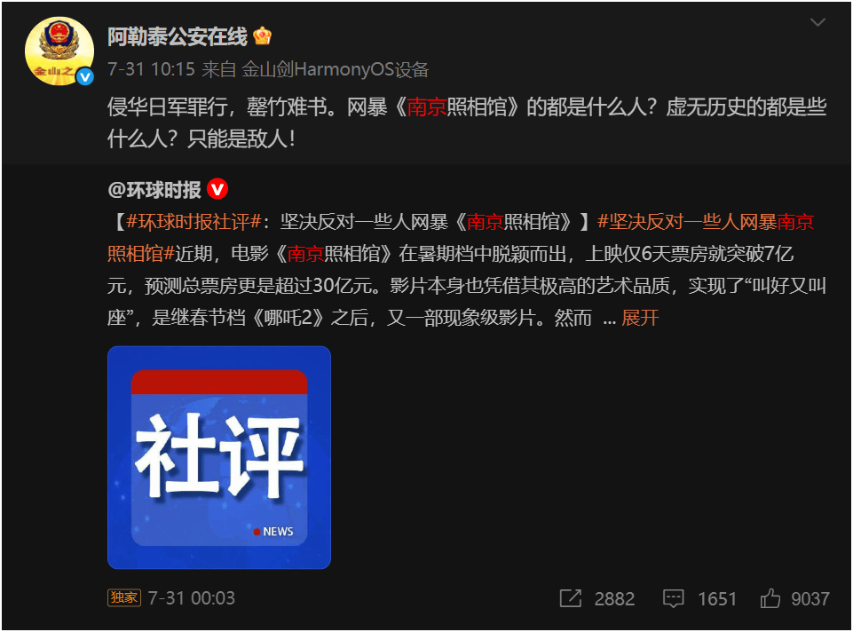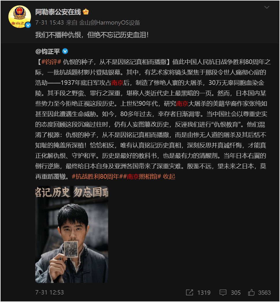 阿勒泰公安在线转发这两个帖子里分别评论指出“我们不播种仇恨,但绝不忘记血泪!”、“侵华日军罪行,罄竹难书。网暴《南京照相馆》的都是什么人?虚无历史的都是些什么人?只能是敌人!”