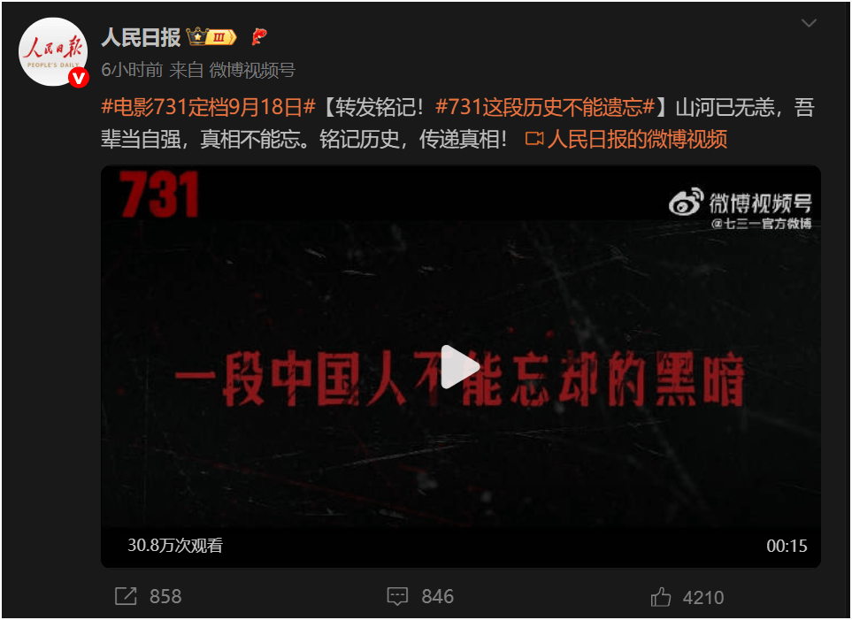 可是让发通稿的这些“敌人”难受的是,不止电影《南京照相馆》赢得高票房、高口碑,揭露日本法西斯、日本军国主义、日本侵略军曾经在中国犯下滔天罪恶更彻底、更直接的电影《731》,已经定档在9月18日公映。