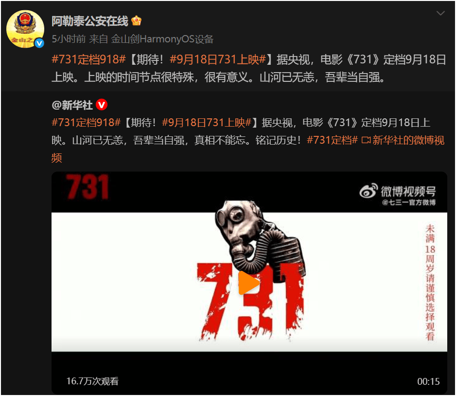 最后,用阿勒泰公安在线所说的结束今天的内容:山河虽安,伤痕犹在。铭记,不是为了仇恨,而是为了防止遗忘;纪念,不是停留过去,而是走向更坚定的未来。#731定档# 吾辈当自强,莫忘国殇。