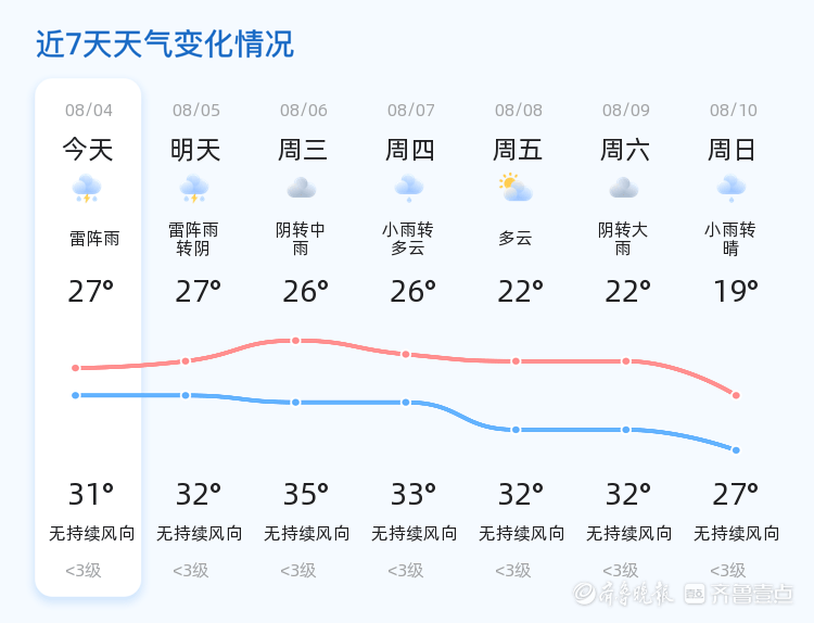 未来三天,聊城天气趋势为阴雨天气为主,其中8月6日(周三)将出现中雨天气,气温在26℃到35℃之间。周三的降雨可能对交通造成一定影响,建议市民提前规划出行路线,避免强降雨时段外出。此外,由于湿度较大,市民应注意防暑降温,适时补充水分。