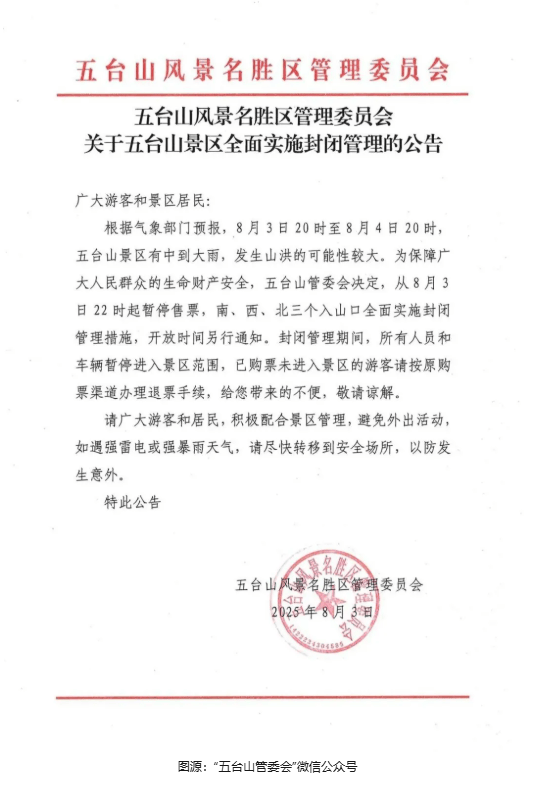 8月3日21时,五台山景区发布通知,从8月3日22时起暂停售票,南、西、北三个入山口全面实施封闭管理措施,开放时间另行通知。具体如下: