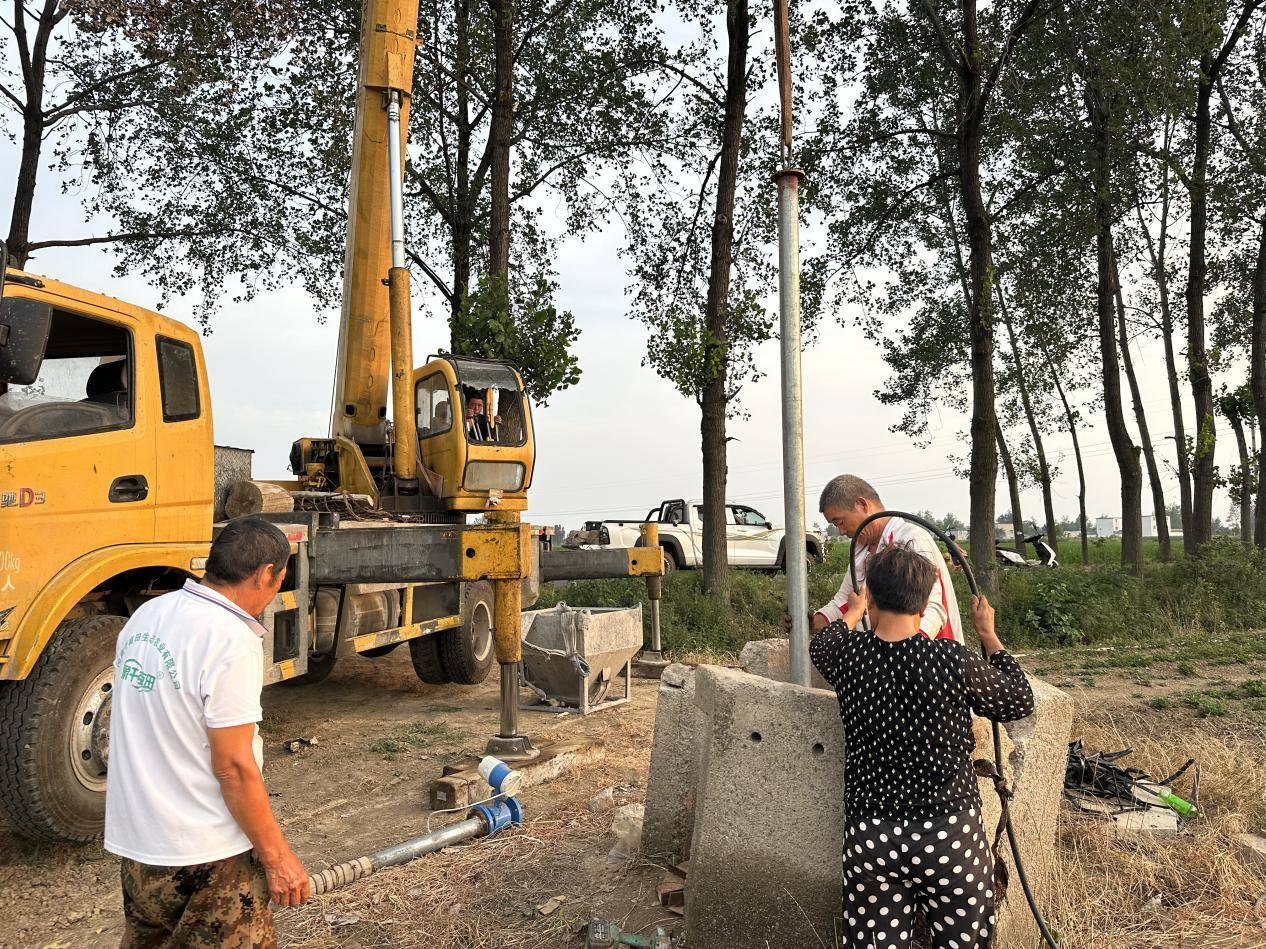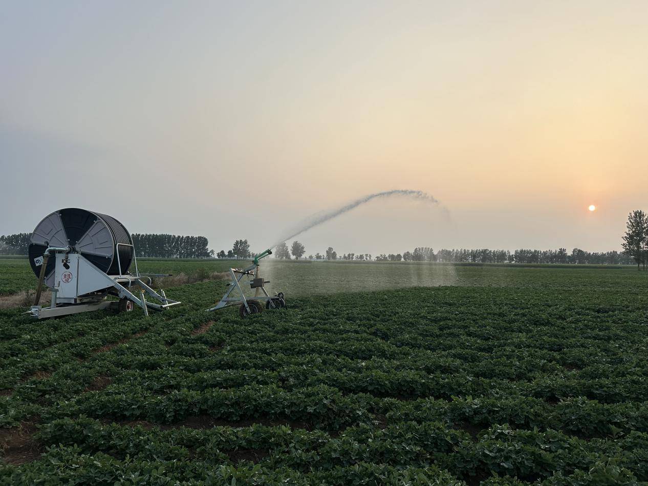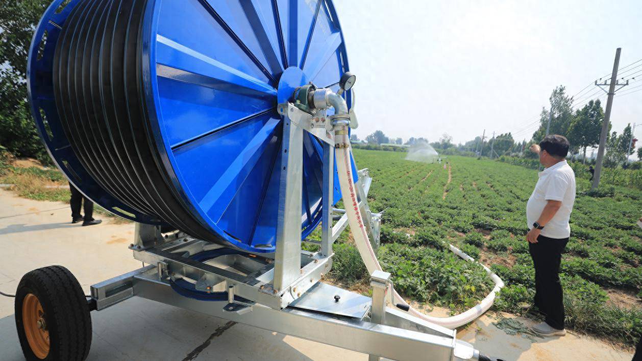 在确山县盘龙街道周湾社区,新购进的卷盘式喷灌机正在为花生田浇灌。据社区党支部书记姜红岩介绍,为了抗旱保秋,社区打了4眼深水井,同时利用河道改造提升后蓄水,为抗旱提供水源。