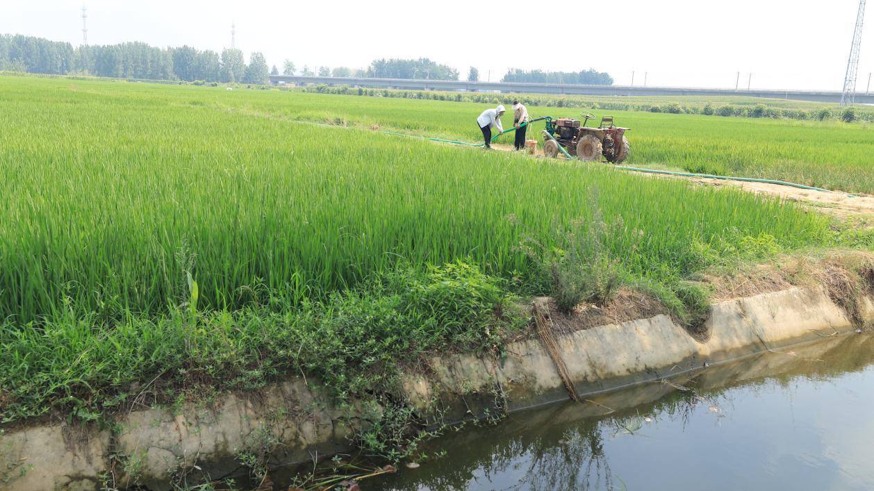 在确山县任店镇巩庄村,来自薄山水库的水经过灌渠,流入一块块稻田内。当地群众正在田间开展辅助引水,让水源得到充分利用。