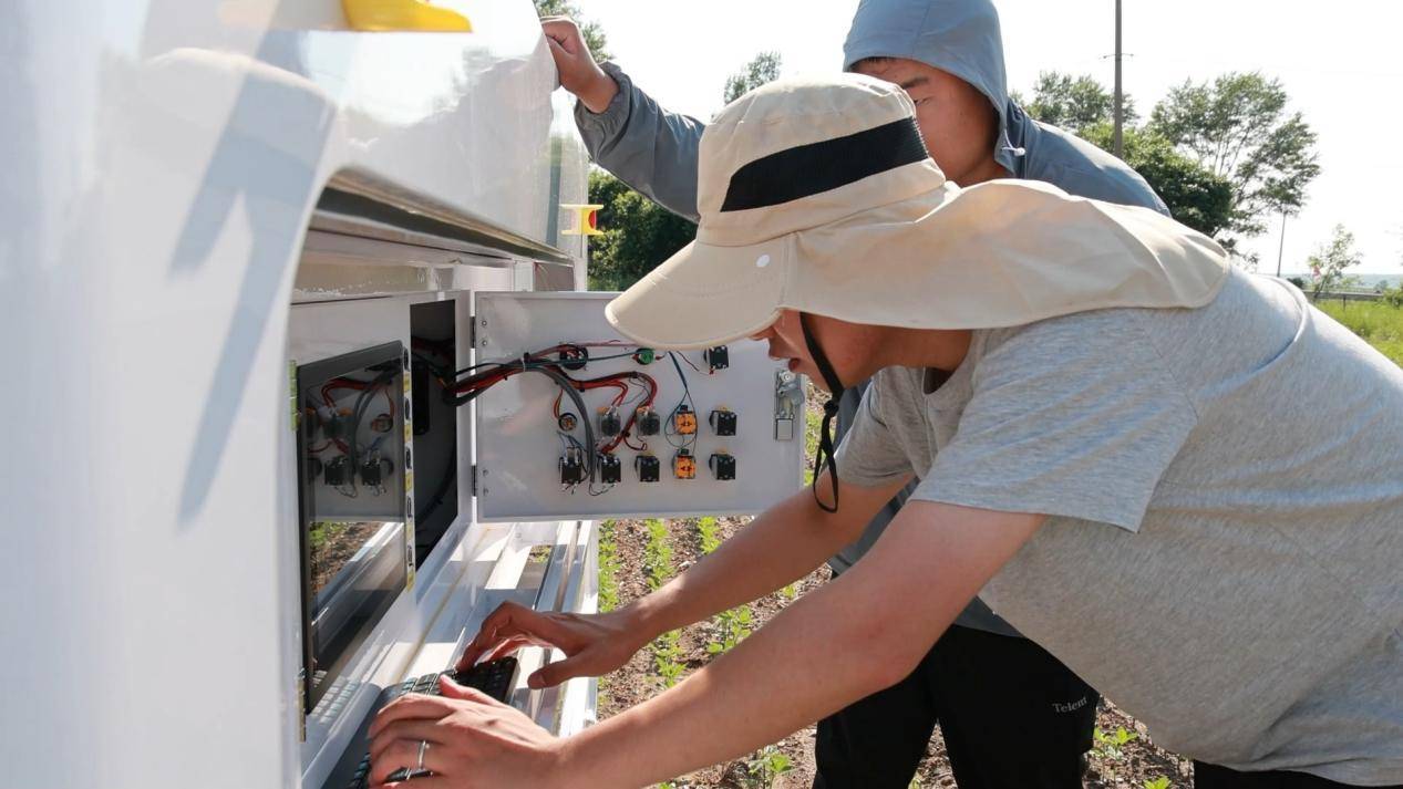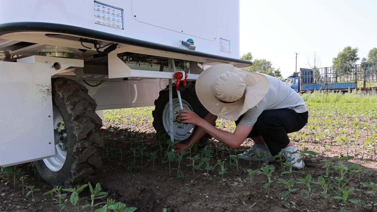 哈尔滨工业大学机器人技术项目科研人员现场测量机器人与农田间距数据。黑河市爱辉区融媒体中心供图