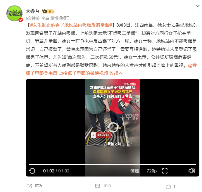 8月3日,江西南昌的徐女士去乘坐地铁时发现两名男子在站内吸烟,上前劝阻表示“不想吸二手烟”,却遭对方同行女子抢夺手机、辱骂并掌掴,徐女士在争执中反击踢了对方一脚。