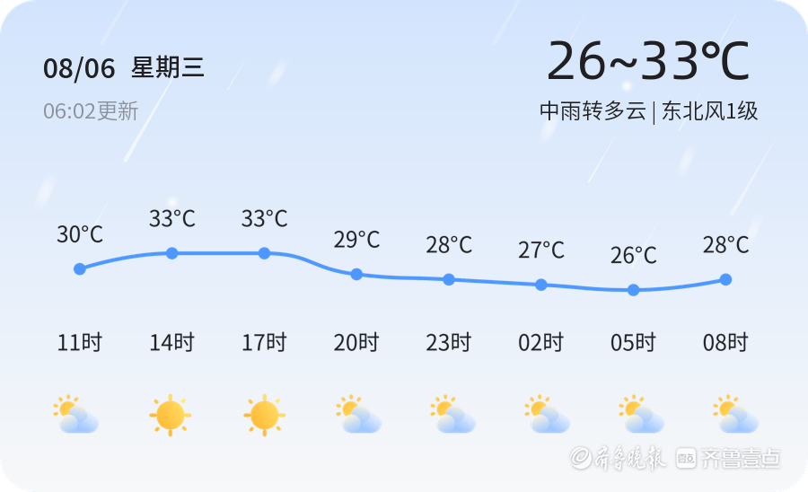 今天是8月6日,农历润六月十三。东营市迎来中雨转多云的天气,气温在26℃至33℃之间,东北风1级,空气湿度较高,达到95%。当前空气质量状况良好,PM2.5指数为24,属于良好等级。市民出行时建议携带雨具,注意防雨防滑,同时可以适当调整着装以应对天气变化。