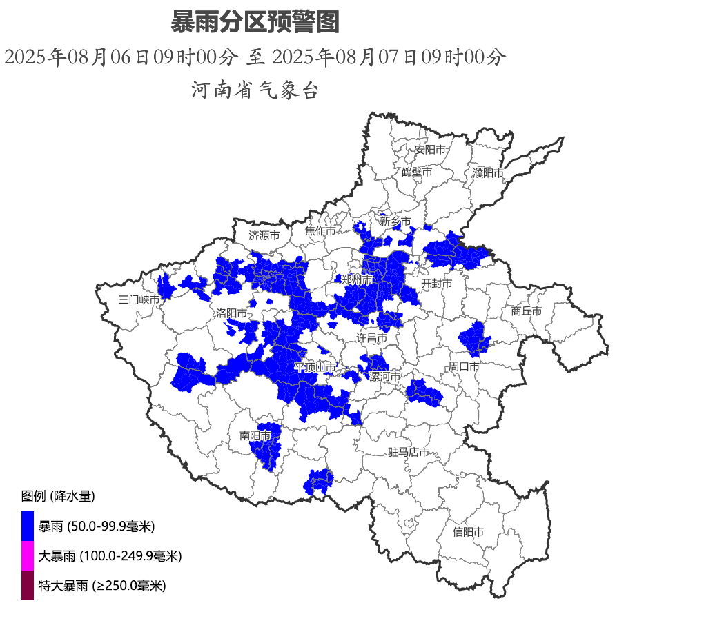 河南省气象台2025年8月6日9时发布暴雨蓝色预警:预计6日9时至7日9时,新乡中东部、三门峡东部、洛阳、郑州西部和东部、开封西部和北部、平顶山、许昌、漯河、周口北部和西南部、商丘西南部、南阳北中部和东南部、驻马店北部部分县(市、区)有暴雨,局地大暴雨,并伴有短时强降水(最大小时降水量40到70毫米,个别点80到100毫米)、雷暴大风(8到9级)等强对流天气。请密切关注属地气象部门发布的最新预报信息和气象灾害预警信号,做好防范应对工作。上述地区的相邻县(市、区)也需关注。