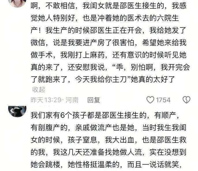 “我就是她曾经接诊的一位产妇,她对待产妇温柔细心!”IP地址为河南的网友“童心静心”告诉记者,她曾经和邵医生接触过,2016年时自己找她产检,9年前过去了,对邵医生依然印象深刻。“她太好了,太可惜了。我们接触过她的人,一时间都接受不了这个事!”