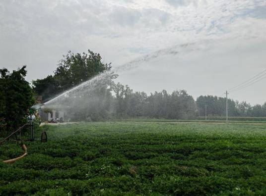 在荀营村的另一处花生地里,村民正在使用喷灌机对花生进行灌溉,这种喷灌机可以把水管中喷出的水击打成雾状,然后均匀地落在秋粮作物上。喷灌机在不停地旋转喷水,能够覆盖的粮食作物面积很大。据村民介绍,这种喷灌机能够控制喷水位置和水量,带有轮子方便移动,可以节省大量劳动力,深受村民们的喜爱。