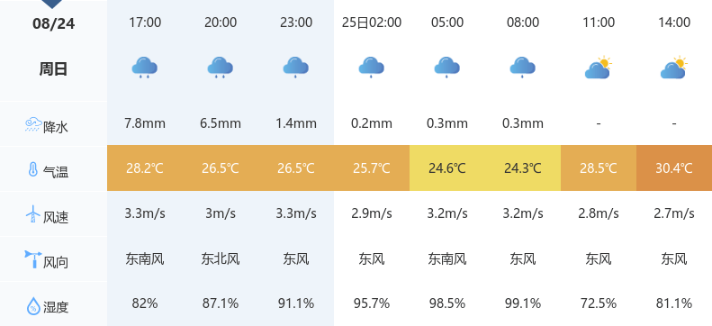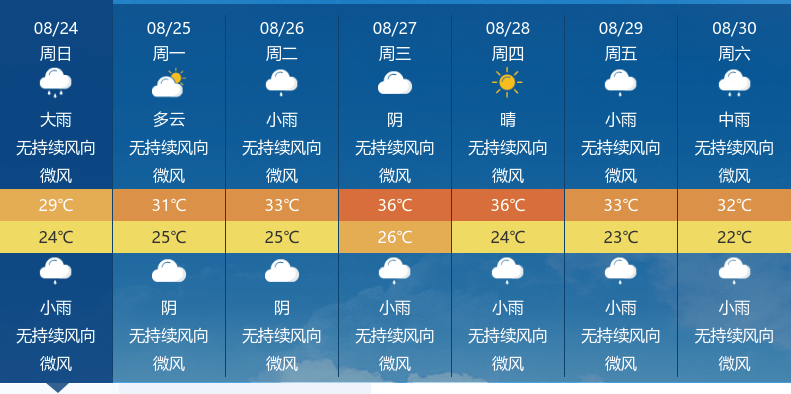 今天是2025年8月24日,十堰天气白天为大雨,夜晚为小雨,最高气温29℃,最低气温24℃,微风,空气湿度91%,体感温度29.0℃,空气质量优。市民外出需携带雨具,注意道路湿滑,驾车请减速慢行,保持车距。