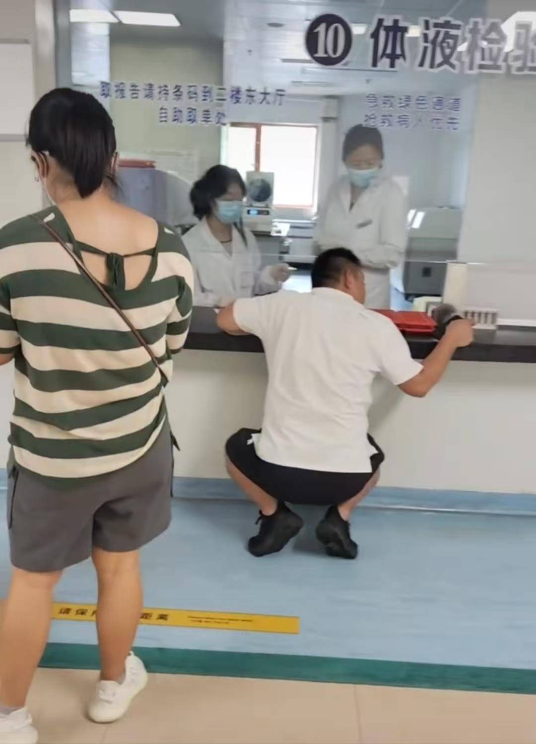 25日,威海市妇幼保健医院工作人员告诉极目新闻记者,该窗口为二楼大小便检验科窗口,患者只需通过窗口将检验样本递进去即可,不需要在此等待、问诊、拿报告,“一般(患者)只需把标本从窗口递进来就可以走了,即使需要和医生交流,站着也可以听清,这是第一次碰到这种(需要蹲着)的情况。”而医院的采血窗口设置了椅子,患者不需“蹲着”采血。
