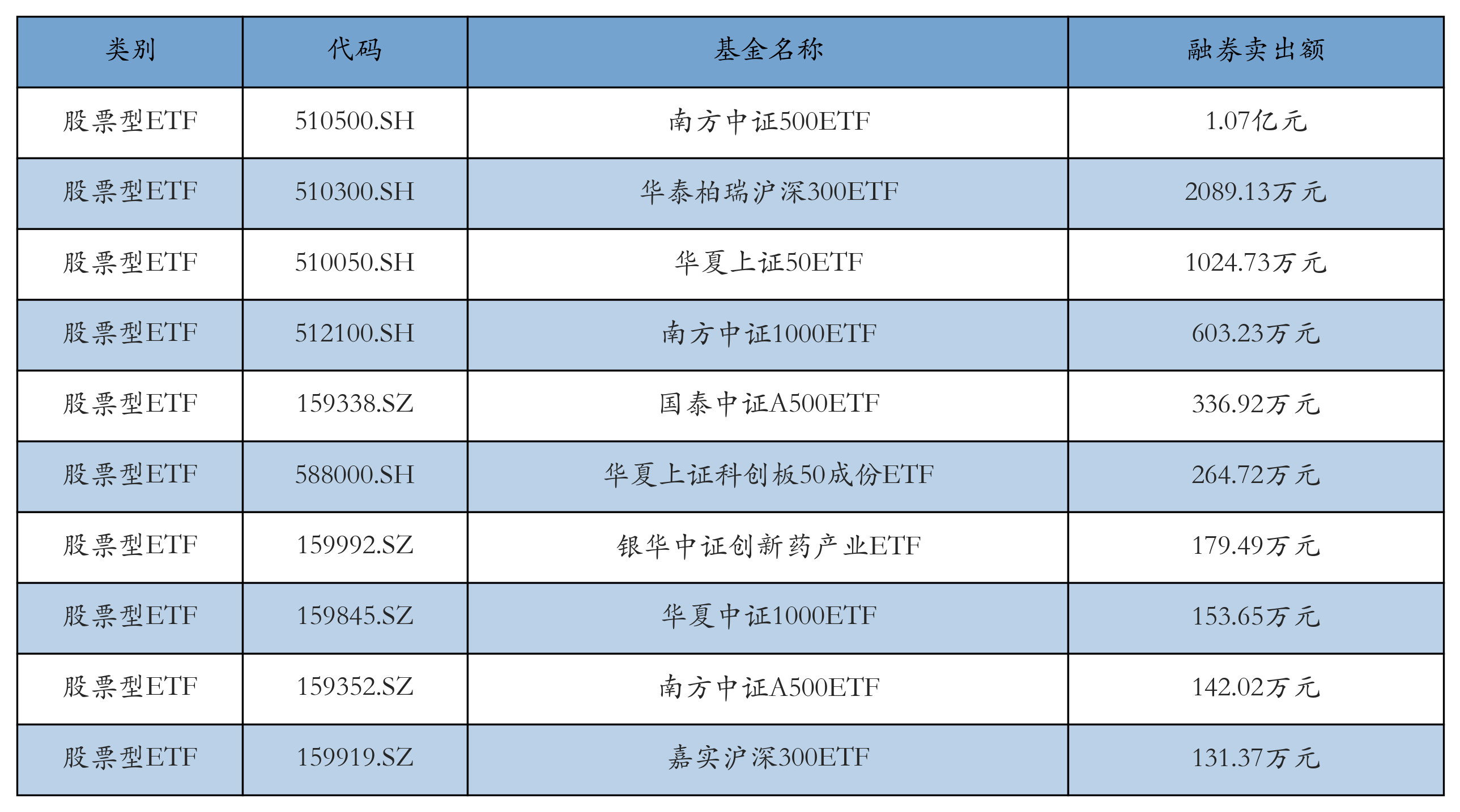 昨日股票型ETF融资卖出额最高的3只ETF及其卖出金额分别为:南方中证500ETF(1.07亿元)、华泰柏瑞沪深300ETF(2089.13万元)、华夏上证50ETF(1024.73万元)。融券卖出额前10详情见下表: