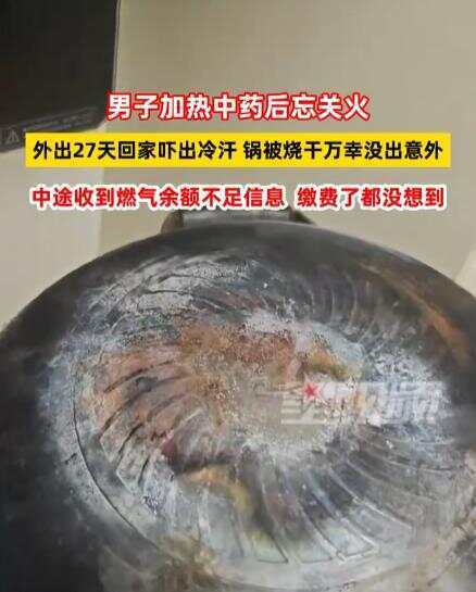 近日,男子加热中药后忘关火,外出27天回家吓出冷汗,锅被烧干万幸没出意外。