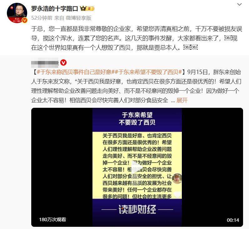 15日,罗永浩也转发了媒体关于于东来谈西贝事件的文章,并表示:“于总,您一直都是我非常尊敬的企业家,希望您弄清真相之前,千万不要被损友误导,搅这个浑水,连累了您的名声。这几天的事件发酵,大家都看出来了,现在这个世界如果真有一个人想毁了西贝,那就是贾总本人。”