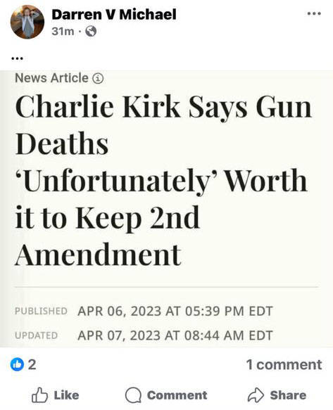 声明没有提到迈克尔发布的帖文内容。但一些美国网民的截图显示,用户名为“达伦·V·迈克尔”、简介为“APSU教授”的Facebook账号转发了美国《新闻周刊》2023年的一篇报道,其标题为“查理·柯克说,为了维护宪法第二修正案,不幸发生枪击死亡是值得的”。