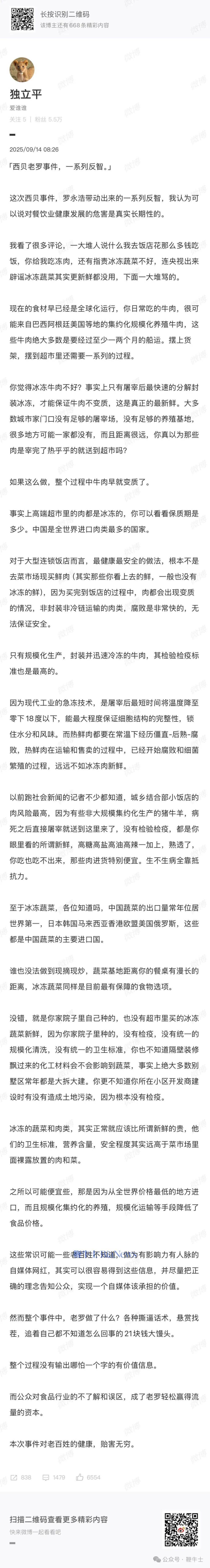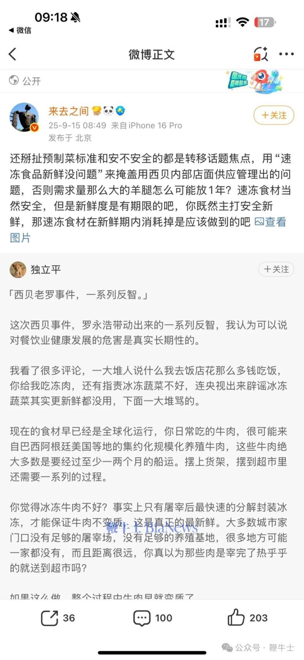 来去之间转发微博网友独立平文章称,还掰扯预制菜标准和安不安全的都是转移话题焦点,用“速冻食品新鲜没问题”来掩盖用西贝内部店面供应管理出的问题,否则需求量那么大的羊腿怎么可能放1年?速冻食材当然安全,但是新鲜度是有期限的吧,你既然主打安全新鲜,那速冻食材在新鲜期内消耗掉是应该做到的吧。