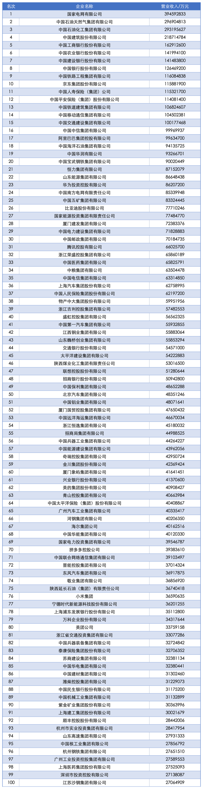 根据榜单,位列前10位的企业是:国家电网有限公司、中国石油天然气集团有限公司、中国石油化工集团有限公司、中国建筑股份有限公司、中国工商银行股份有限公司、中国农业银行股份有限公司、中国建设银行股份有限公司、中国银行股份有限公司、中国铁路工程集团有限公司、京东集团股份有限公司。