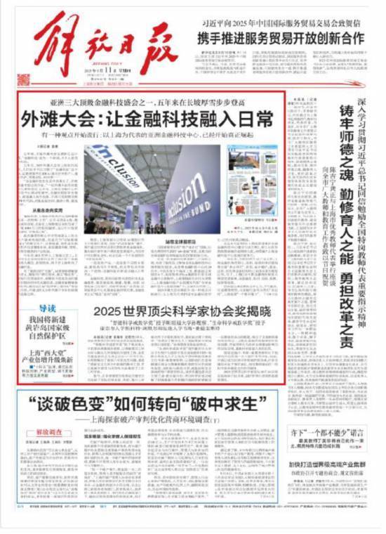 解放日报报道外滩大会开幕和2025顶科协奖揭晓。