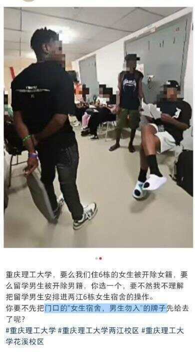 该网帖中的照片里有多名黑人男性。发文者表示,女生们不理解把留学男生安排进两江6栋女生宿舍的操作,门口还挂有“女生宿舍,男生勿入”的牌子。