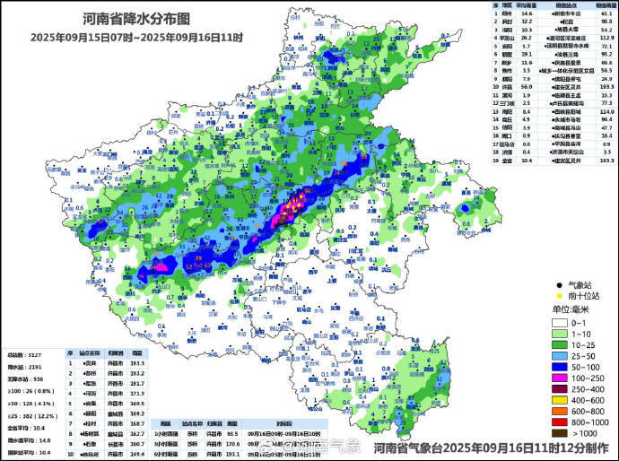 记者从省气象台获悉,9月16日7时至11时:我省中西部、北部、东部出现小到中雨,许昌、新乡、鹤壁、开封等地部分县(市、区)出现大到暴雨,许昌局部出现大暴雨。地市平均降水量前三位分别是:许昌35.3毫米、开封28.9毫米、鹤壁19毫米。大于50毫米的有16个县(市、区)共68站,其中大于100毫米的有4个县(市、区)共13站。降水量位列前三的分别为:许昌市苏桥173.4毫米、许昌市灵井168毫米、许昌市军张161.6毫米。整点最大小时降水量为许昌市苏桥93.5毫米(9月16日9时至10时)。