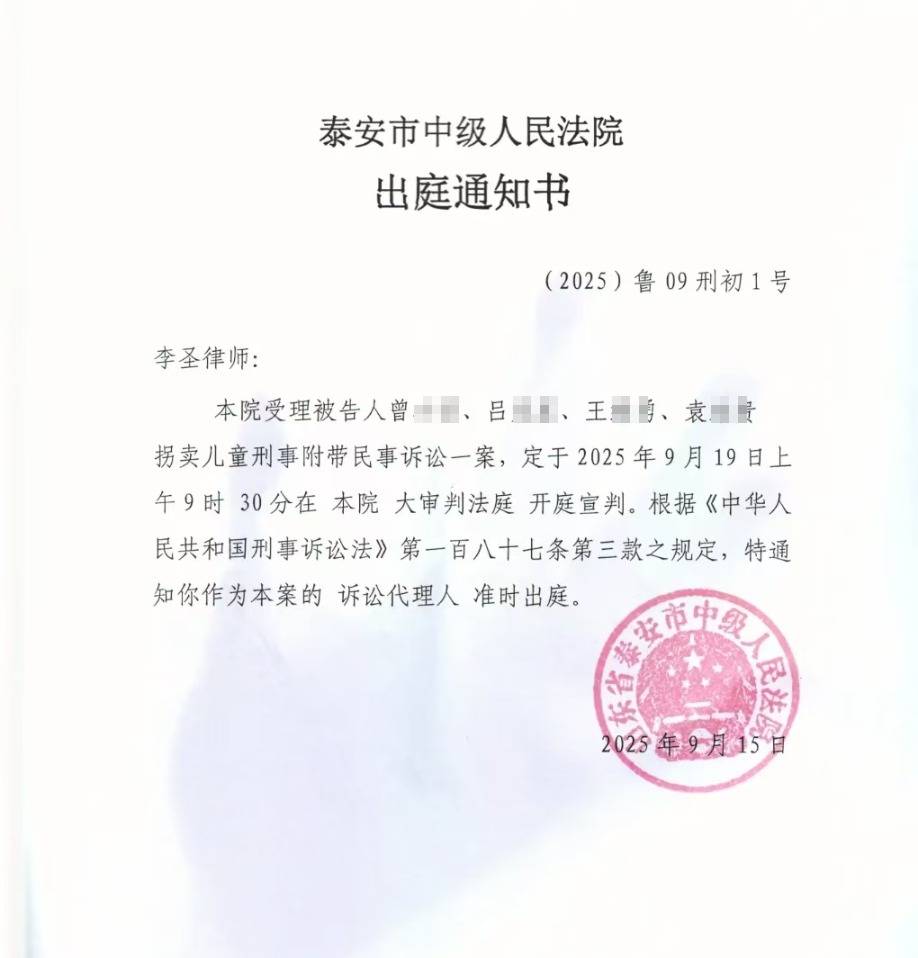 2025年4月2日在泰安市中级人民法院开庭审理了这起案件,被告人曾某、吕某、王某、袁某共4人被控犯拐卖儿童罪。经过数小时的庭审,该案休庭,未当庭宣判。