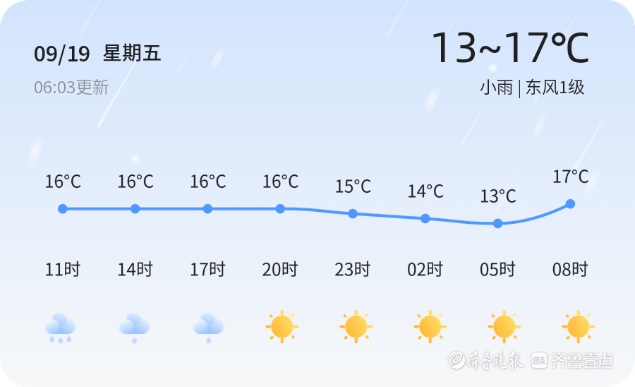 今天是9月19日,星期五,农历七月廿八。潍坊市迎来小雨天气,气温适中,最高气温17℃,最低气温13℃。目前,全市大部分地区均出现小雨,东风1级,空气湿度较高,为89%,PM2.5指数为23,空气质量良好。各区天气情况基本一致,均为小雨天气,市民出行请注意携带雨具。