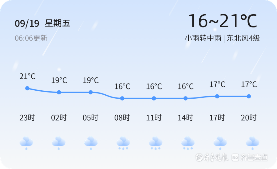 今天是9月19日,星期五,农历七月廿八。日照市今日天气为小雨转中雨,气温在16℃至21℃之间,东北风4级,空气湿度88%,PM2.5指数为23,空气质量良好。各区均出现不同程度的降雨,市民出行需携带雨具,注意交通安全。