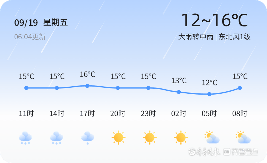 今天是9月19日,星期五,农历七月廿八。济宁市今日天气为大雨转中雨,气温在12℃至16℃之间,东北风1级,空气湿度高达94%,PM2.5指数为19,空气质量优。全市各区均迎来不同程度的降雨天气,市民出行需携带雨具,注意交通安全。