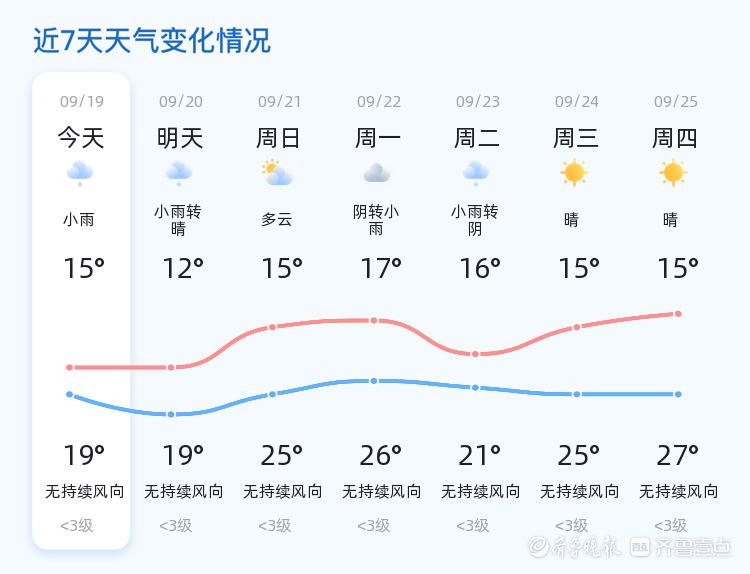 今天是9月19日,星期五,农历七月廿八。德州今日天气为小雨,气温在15℃到19℃之间,湿度较高,风力较小。各区天气情况基本一致,均为小雨天气,风力不大,湿度较高。