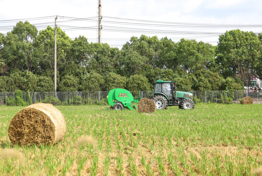 近日,松江区叶榭镇2025年水稻秸秆离田作业现场会在八字桥村田间举行。活动以“实景演示+经验交流”为形式,现场,搂草机率先入场,机械臂灵活运转,将田垄间的秸秆快速归拢成整齐“草条”;打捆机紧随其后,沿“草条”轨迹行进,通过液压系统完成秸秆压实、裹膜作业,几分钟内即可产出直径和宽度均为约1.2米的紧实秸秆包。本次活动旨在松江区秸秆机械化还田的基础上,探索“五料化”综合利用模式。