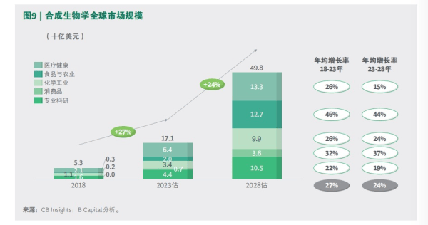 据上海合成生物学创新中心和波士顿咨询公司共同发布的《中国合成生物产业白皮书 2024》显示,全球合成生物学市场规模从2018年的53亿美元增长到2023年的超过170亿美元,平均年增长率达27%,预计未来将持续增长,并在2028年达到近500亿美元。