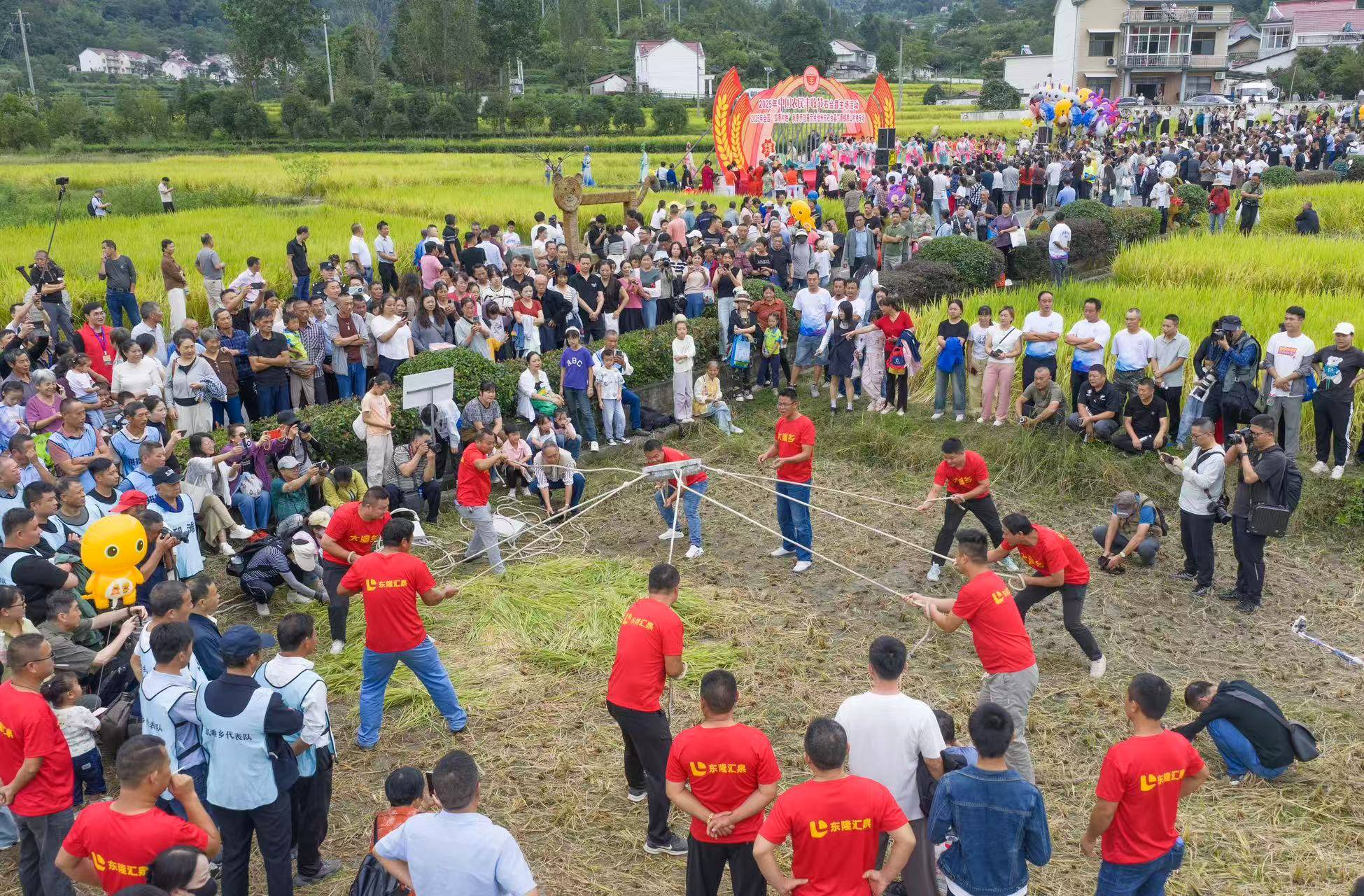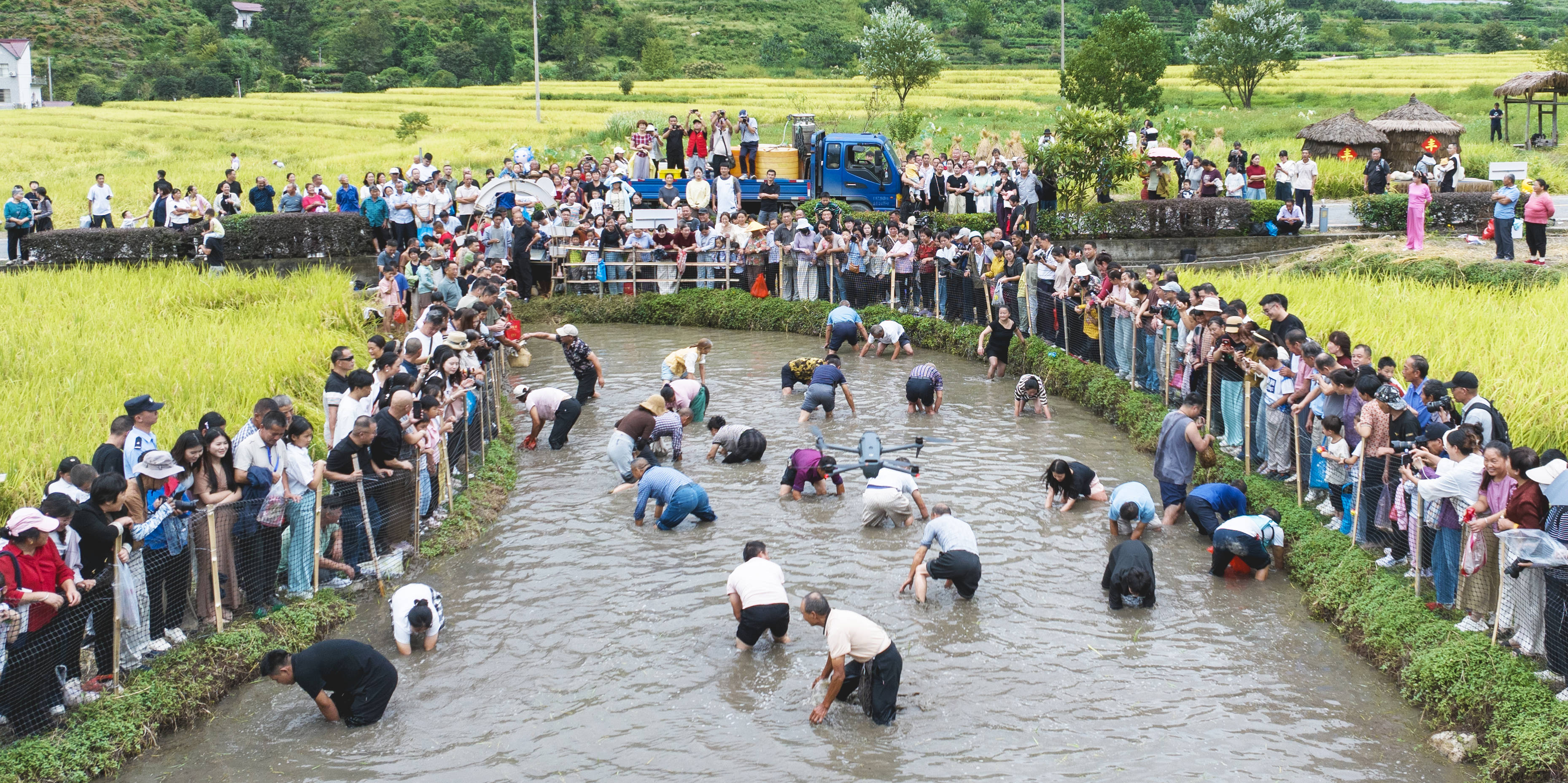 “加油!加油!”稻田里的呐喊声此起彼伏,稻田拔河比赛中,来自各乡镇的代表队队员们脚踩软泥、紧握绳索,身体后倾奋力拉扯;打夯比赛里,队员们默契配合,跟着号子节奏起落木夯,汗水浸湿衣衫却笑容灿烂。徒手抓鱼活动更是吸引了众多游客参与,“3、2、1,开始!”随着哨声响起,稻田瞬间沸腾,村民与游客挽起裤腿,在泥水中追逐游鱼,体验农耕乐趣。
