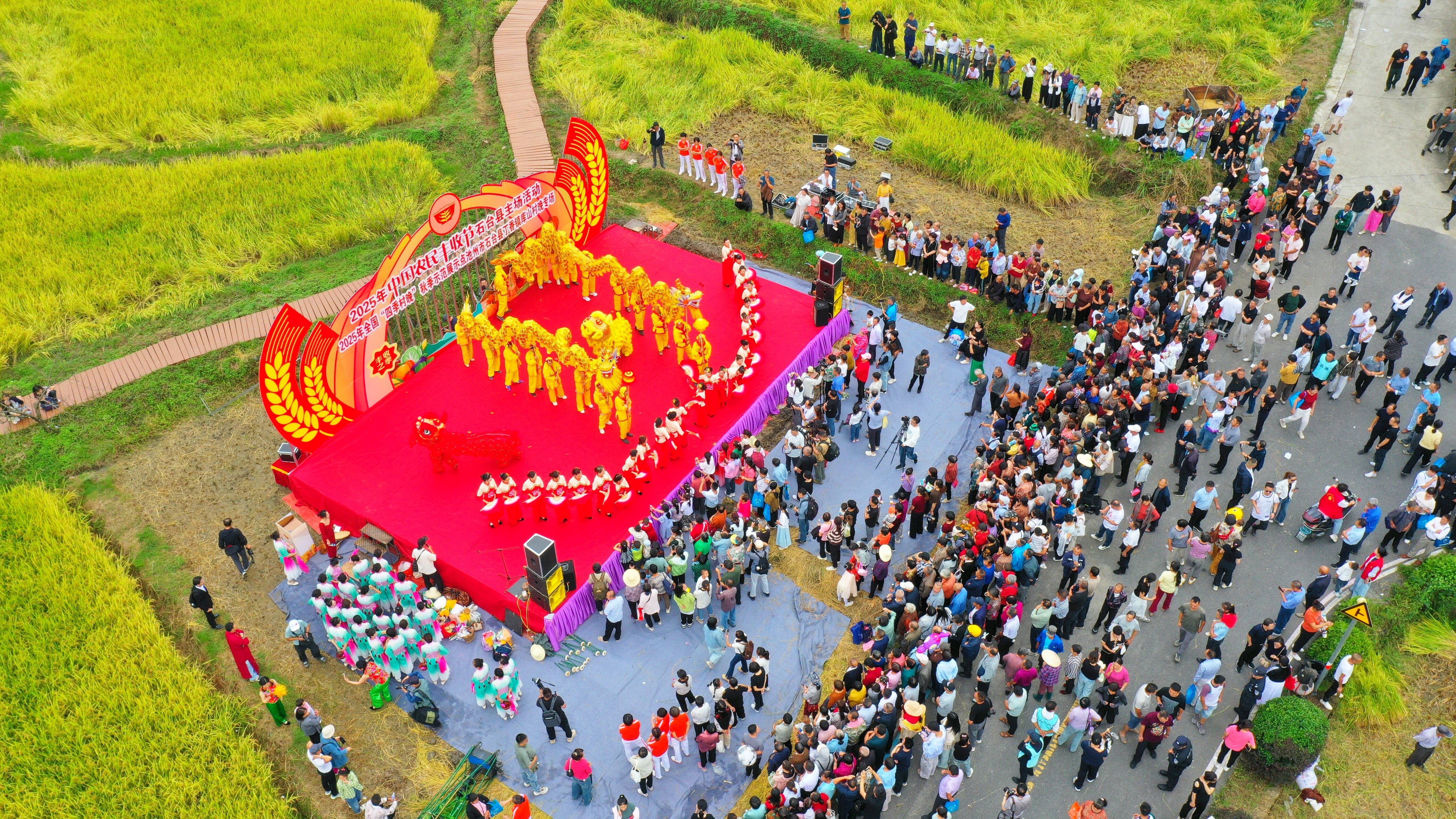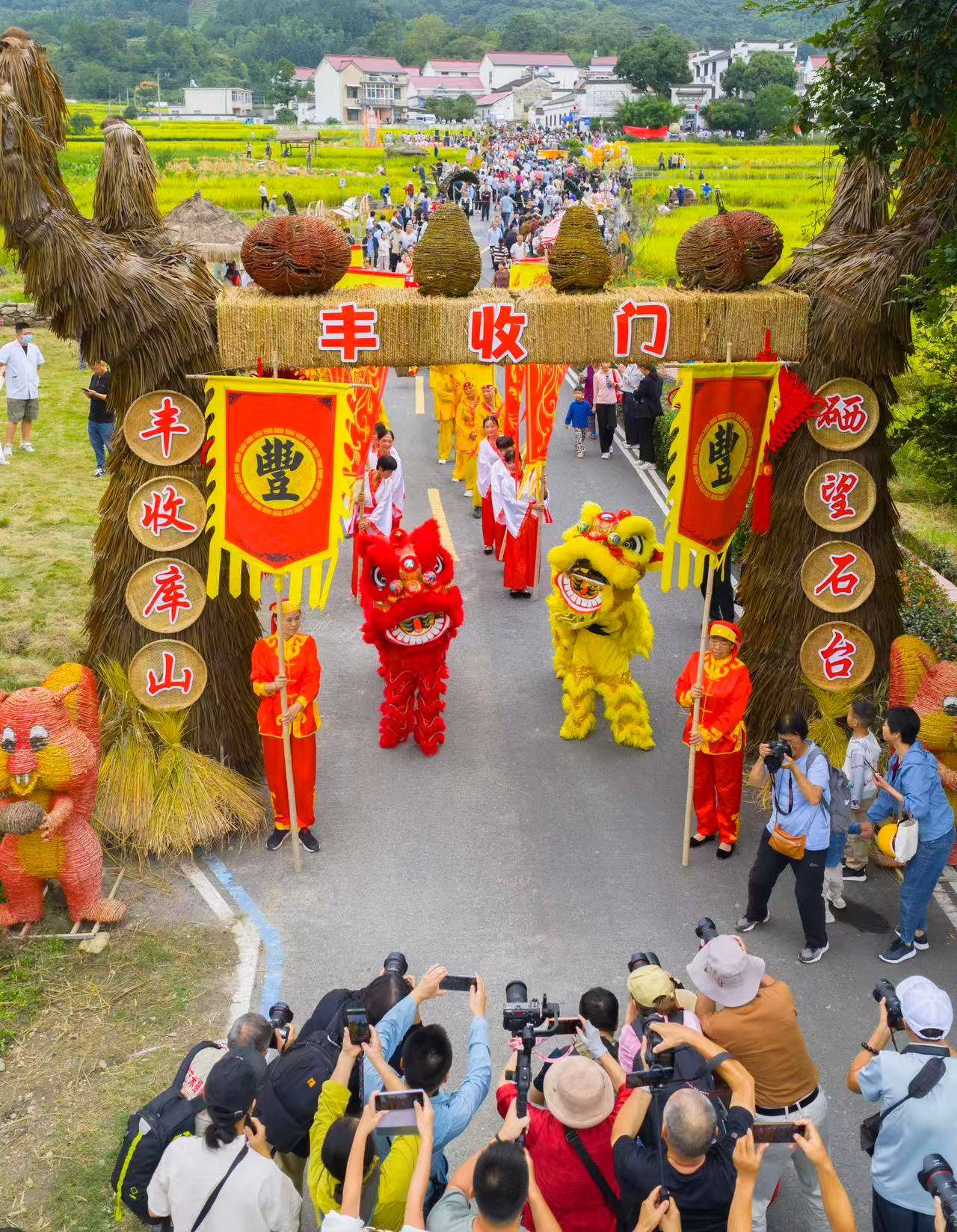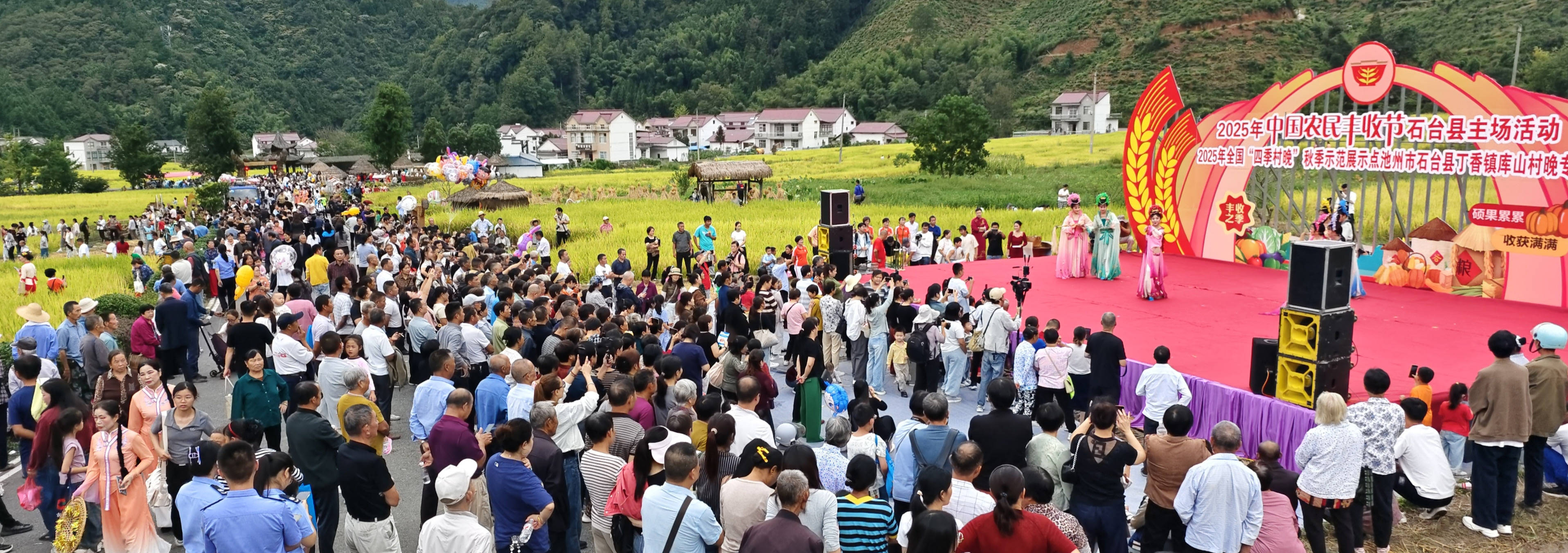 据了解,本届丰收节采用“1+9”系列活动模式,1场启动仪式拉开序幕,农耕文化巡演、全国“四季村晚”秋季专场、石台复建60周年图片展、乡土绘画展、稻田集市、徒手抓鱼等9项专题活动同步开展,线上线下联动推进,让不能到现场的网友“云逛丰收节”;线下游客们在稻田边逛集市、看展演、玩游戏,沉浸式感受丰收的喜悦。