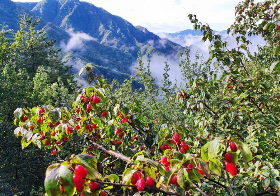 新华社郑州9月21日电(记者吴刚)进入仲秋,河南省南阳市西峡县桑坪镇漫山红果在晨曦中闪着亮光,伴着山中薄雾,65岁的村民卫成献穿行林间,查看山茱萸长势。