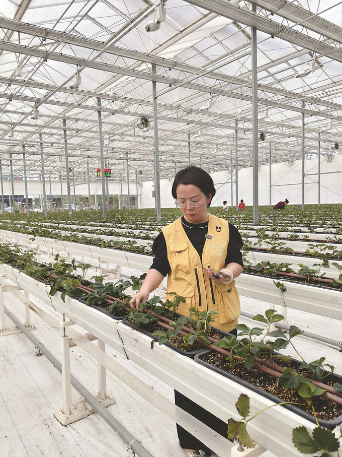 陈颖在草莓大棚查看草莓苗生长情况。 吴琼 摄