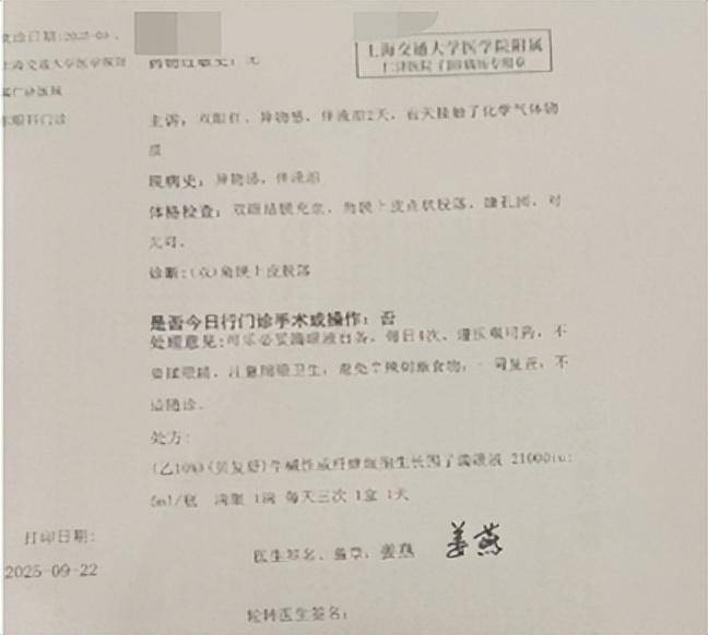 医院诊断记录显示,诊断为(双)角膜上皮脱落;呼吸道感染(化学损伤),医生提醒不要揉眼睛,注意用眼卫生。一周复查,不是随诊。