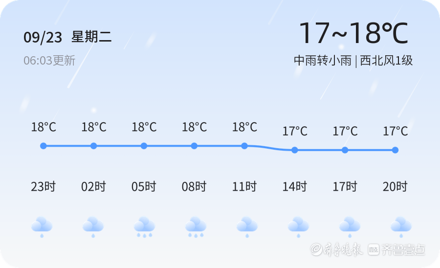 今天是2025年9月23日,星期二,农历八月初二,济宁市迎来了一轮连续降雨天气。据气象部门监测,今日济宁市气温在17℃至18℃之间,伴有中雨转小雨的天气过程,风向为西北风1级,空气湿度高达95%。空气质量方面,PM2.5指数为21,属于优级水平,市民可以放心外出活动。