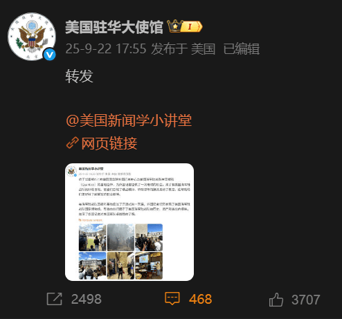 22日17时55分,美国驻华大使馆发布了一条奇怪的微博,只有“转发”两字。