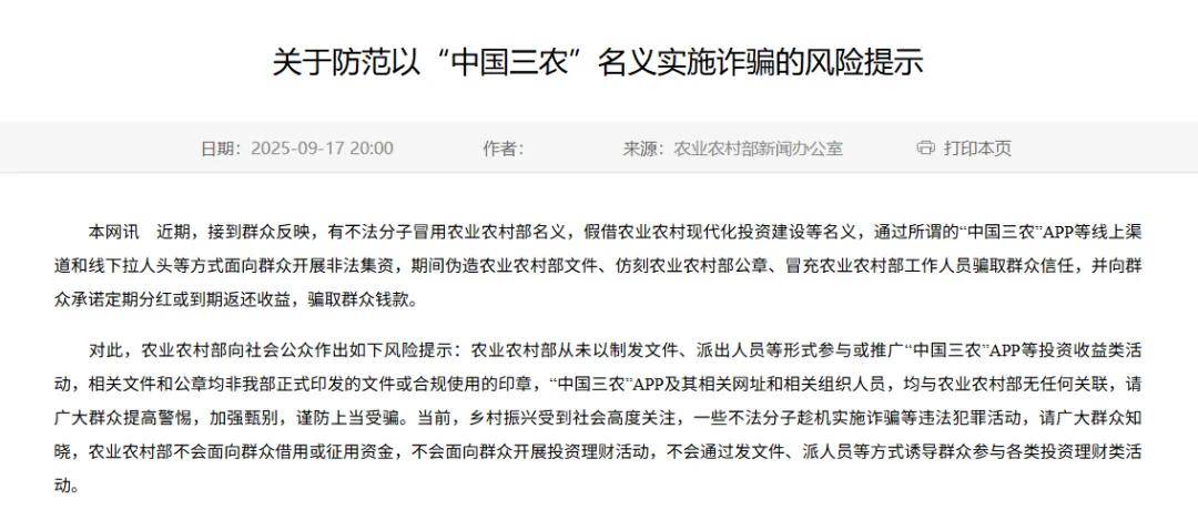 9月17日,农业农村部发布《关于防范以“中国三农”名义实施诈骗的风险提示》。