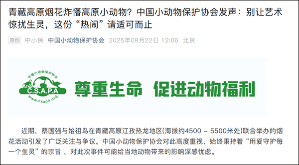 9月22日中午,微信公众号“中国小动物保护协会”发布文章《别让艺术惊扰生灵,这份“热闹”请适可而止》。文章中指出,协会高度重视蔡国强与始祖鸟联合举办的烟花活动,并对此次事件可能对当地动物造成的影响深表忧虑。