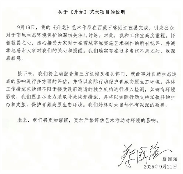 当天,蔡国强工作室发布致歉声明。声明表示将主动配合第三方机构及相关部门,就此事对自然生态造成的影响进行多方面的评估,并将以实际行动保护青藏高原生态环境。
