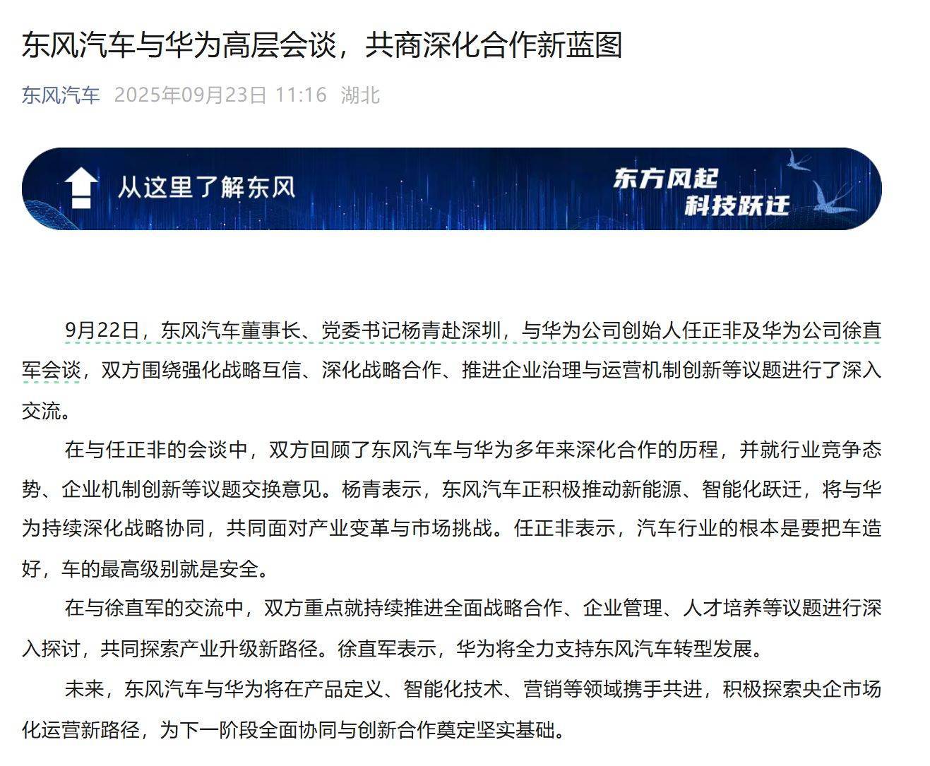 在与任正非的会谈中,双方回顾了东风汽车与华为多年来深化合作的历程,并就行业竞争态势、企业机制创新等议题交换意见。