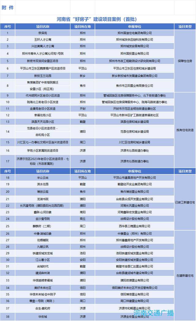 9月23日,记者从河南省住房城乡建设厅获悉,为贯彻落实全国住房城乡建设工作会议精神,加快推进“好房子”建设,更好满足人民群众对优质住房的新期待,近日我省公布首批“好房子”建设项目案例。