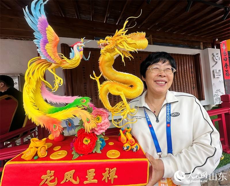 青岛王哥庄大馒头制作人展示面塑产品。人民网 乔姝摄