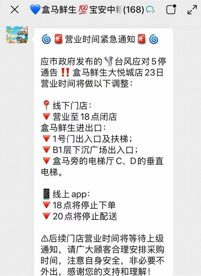 在配送保障方面,盒马为配送人员准备了雨衣、雨鞋等防汛防台风物资,物流车辆和线路规划上提前进行了部署,于加工中心准备备用发电机来应对停电等突发问题。 同时,盒马将根据属地政策要求,对配送服务和范围进行及时调整。盒马工作人员介绍,深圳地区23日下午在全市范围内实行“五停”,盒马各门店也将根据天气变化计划双端提前结束营业,保障一线人员安全。