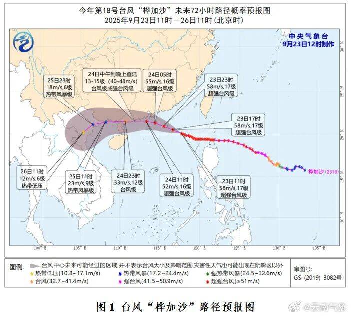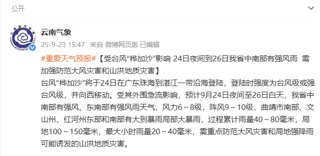 预计9月24日夜间至26日白天,台风“桦加沙”逐渐减弱为热带低压,受其外围急流影响,云南省中南部有强风、东南部有强风雨天气。
