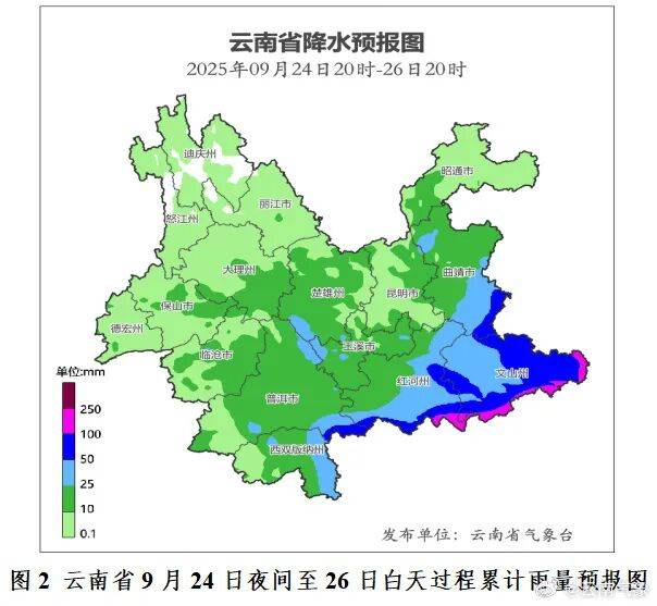 9月24日夜间至25日:文山州东部有大到暴雨局部大暴雨,曲靖市南部、文山州西部、红河州东部有中雨局部大雨,有6~7级大风,阵风8级。