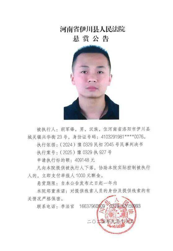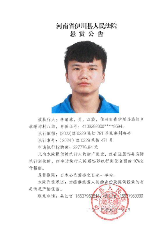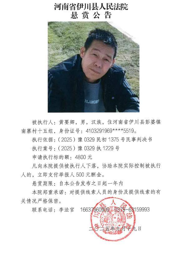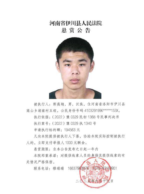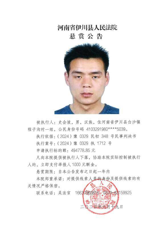 为进一步加大执行力度、发动社会力量查找财产线索、有效打击被执行人逃避债务行为,切实维护申请执行人的合法权益,伊川法院根据申请执行人的申请,依照《中华人民共和国民事诉讼法》第二百六十二条、《最高人民法院关于民事执行中财产调查若干问题的规定》第二十一条、第二十二条、第二十四条、《最高人民法院关于依法制裁规避执行行为的若干意见》第5条等相关规定,发布执行悬赏公告如下: