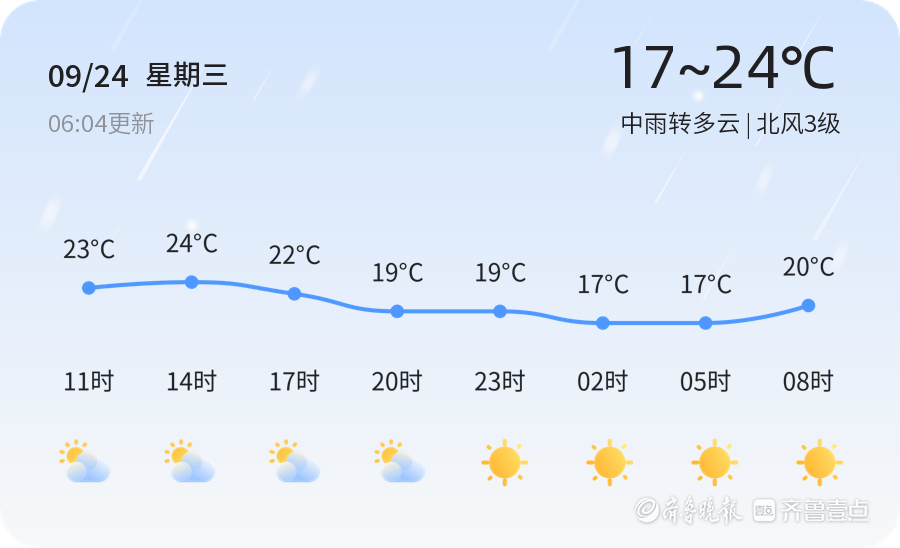 今天是9月24日,星期三,农历八月初三。日照市今日天气为中雨转多云,气温在17℃至24℃之间,北风3级,空气湿度较高,达到93%。目前,全市各区天气基本一致,均为中雨转多云,市民出行请注意携带雨具,注意交通安全。